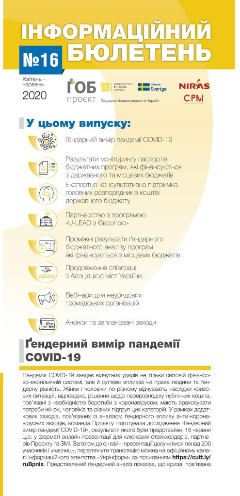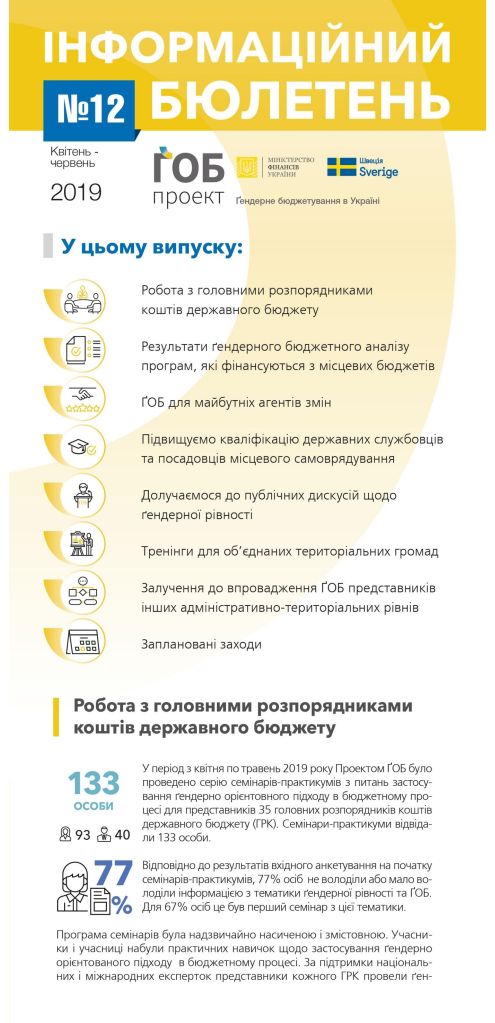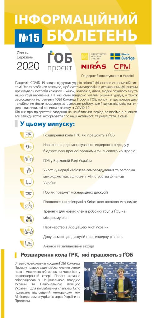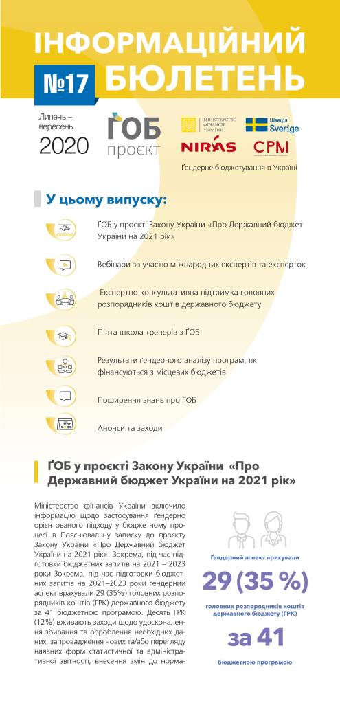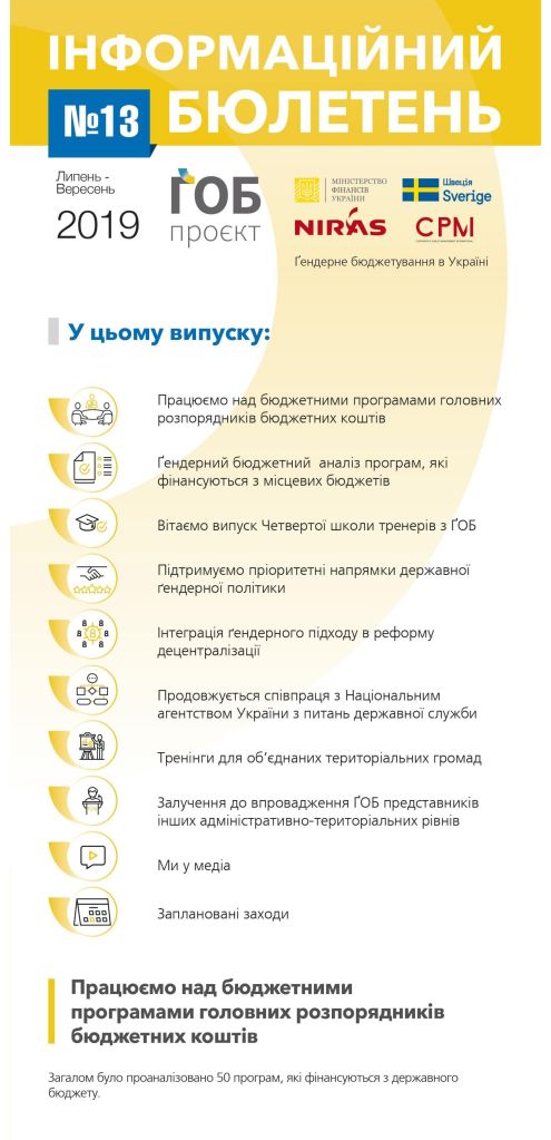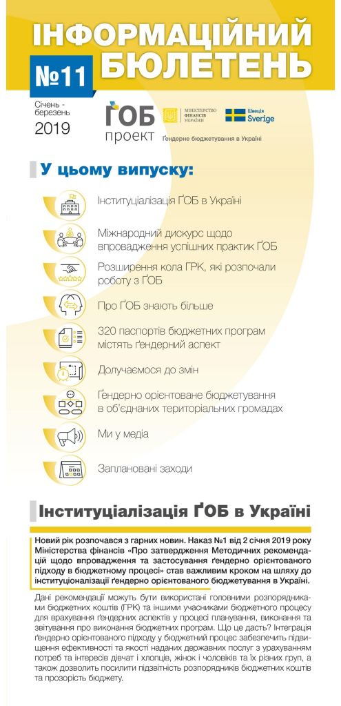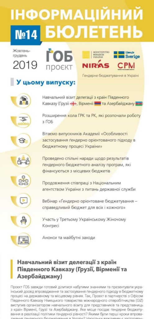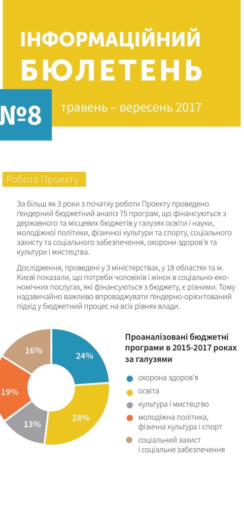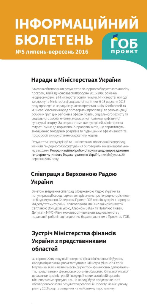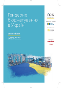 Публікації/Publications Гендерне бюджетування в Україні. (Стислий звіт 2013-2020) The Summary Report (2013 — 2020) Gender responsive budgeting project in Ukraine: Results and Reflections Порадник щодо застосування гендерно-орієнтованого підходу в окремих галузях Гендерно орієнтований підхід у бюджетному процесі (практичний посібник) Застосування гендерно орієнтованого підходу в бюджетному процесі Основи гендерно орієнтованого бюджетування (методичні рекомендації до дисципліни) Оцінювання держаних видатків та фінансової підзвітності (ДВФП) в Україні 2019 р Ґендерний вимір пандемії_COVID-19 Gender dimension of the COVID-19 pandemic Сучасні тенденції розвитку і практики гендерно-орієнтованого бюджетування Current trends of development and practices of the genderresponsive budgeting at the global, European and national levels Впровадження гендерно орієнтованого підходу у бюджетному процесі Проблеми гендерної рівності у галузі охорони здоров»я Gender Equality in the Health Care Sector Проблеми гендерної рівності в галузі культури та мистецтва Gender equality issues in the culture and art sector Проблеми гендерної рівності у галузі фізичної культури та спорту Gender Equality in the Physical Training and Sport Sector Проблеми гендерної рівності у галузі освіти Gender Equality in the Education Sector Ґендерний бюджетний аналіз програм/Gender Budget Analysis Гендерно-орієнтоване бюджетування: аналіз програм, які фінансуютьсяз бюджету,зпозиціїгендерної рівності Manual Gender Responsive Budgeting Гендерний бюджетний аналіз програм, які фінансуються з державного та місцевих бюджетів Gender budget analysis_2016 Гендерний бюджетний аналіз програм Пілотних областей та галузевих міністерств Gender budget analysis_2015 Інформаційні бюлетені Інформаційний бюлетень № 17 (липень/вересень 2020р.) inform lefleat 17-en Інформаційний бюлетень № 16 (квітень/червень 2020р.) Інформаційний бюлетень № 15 (січень/березень 2020р.) inform lefleat 15-en Інформаційний бюлетень № 14 (жовтень/грудень 2019р.) inform lefleat 14-en Інформаційний бюлетень № 13 (липень/вересень 2019р.) inform lefleat 13-en Інформаційний бюлетень № 12 (квітень/червень 2019р.) inform lefleat 12-en Інформаційний бюлетень № 11 (січень/березень 2019р.) inform lefleat 11-en Інформаційний бюлетень № 8(травень/вересень 2017р.) Інформаційний бюлетень № 7 (лютий/квітень 2017р.) Інформаційний бюлетень № 6 (жовтень/січень 2017р.) Інформаційний бюлетень № 5 (липень/вересень 2016р.) Гендерно орієнтоване бюджетування Про впровадження ґендерно-орієнтованого бюджетування на місцевому рівні в Україні